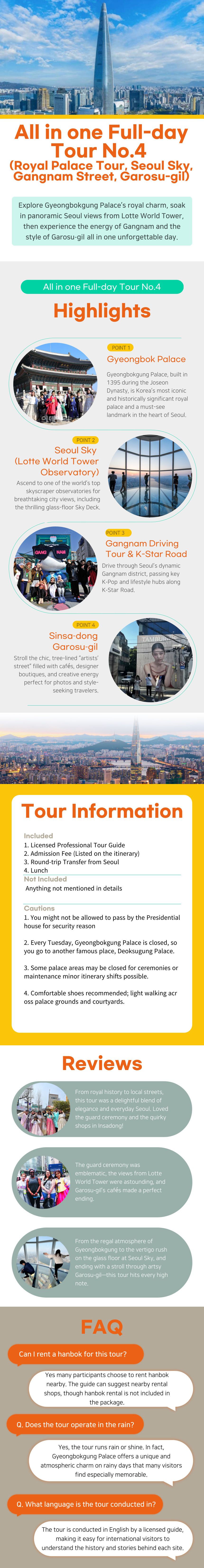 Review for : [Small Group Tour] All in one Full-day Tour No.4 (Royal Palace Tour, Seoul Sky, Gangnam Street, Garosu-gil)