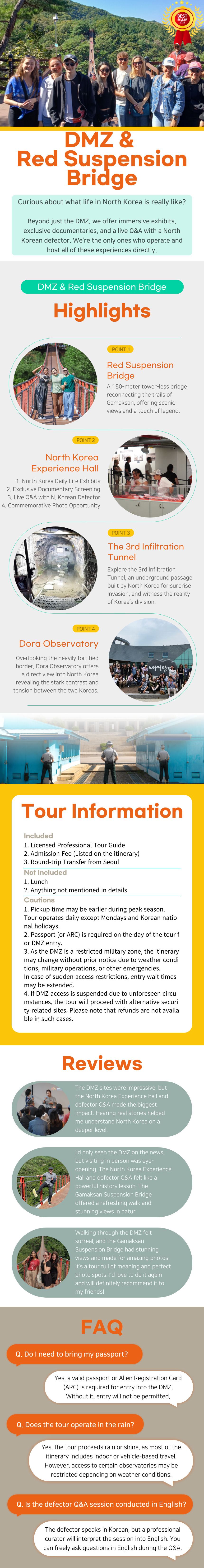 It was a very nice day discovering DMZ for the first time. The tour was really educational on the conflict between South and North Korea. The suspension bridge was a fun stop, we really enjoyed it. The scenery from their was so nice. Our guide, Sue was really friendly and knowledgeable.